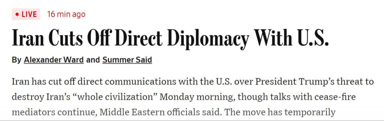 ![[Photo] 🇮🇷🇺🇸❗️— WSJ :- Iran Cuts Off Direct Diplomacy With U.S.](https://tg.i-c-a.su/media/intelslava/86103/5381933900290004325_y_2.jpg)