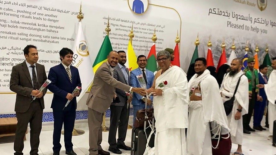 কামরুল ইসলাম। এ সময় হজযাত্রীদের ফুল দিয়ে শুভেচ্ছা জানানো হয় এবং তাদের হাতে রিফ্রেশমেন্ট কিট তুলে দেওয়া হয়। অভ্যর্থনা অনুষ্ঠানে আরও উপস্থিত ছিলেন জেদ্দায় বাংলাদেশ কনসুলেটের কনসাল জেনারেল মো. সাখাওয়াত হোসেন, সহকারী মৌসুমি হজ অফিসার মো. রুহুল আমিনসহ সংশ্লিষ্ট কর্মকর্তারা। সৌদি পক্ষ থেকেও নুসুক মারহাবা সংস্থার প্রতিনিধিরা উপস্থিত ছিলেন। এর আগে শুক্রবার (১৭ এপ্রিল) রাত সাড়ে ১১টায় ঢাকার হযরত শাহজালাল আন্তর্জাতিক বিমানবন্দর-এ হজ ফ্লাইট কার্যক্রমের উদ্বোধন করা হয়। হজ ফ্লাইট-২০২৬ উদ্বোধন করেন প্রধানমন্ত্রী তারেক রহমান। চলতি বছরের হজ কার্যক্রম শুরু হওয়ার মধ্য দিয়ে বাংলাদেশ থেকে হজযাত্রীদের সৌদি আরবে যাত্রা আনুষ্ঠানিকভাবে শুরু হলো।