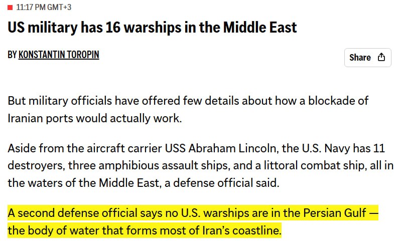 Associated Press :- America has only 16 warships in the region and no warships in Iran's territorial waters, which make up most of Iran's waterways.- This indicates that the ability to blockade Iran's ports with such a small number of ships is very weak.@IntelSlava