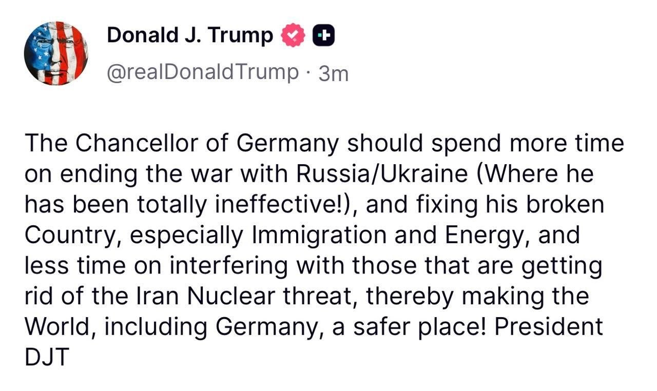 Trump again harshly criticized Merz over Iran and called for focusing on ending the war in Ukraine.The German Chancellor should devote more time to ending the war between Russia and Ukraine (where he has proven to be completely ineffective!) and restoring order in his troubled country, especially in matters of migration and energy, and less time to interfering with those who are eliminating the Iranian nuclear threat, thereby making the world, including Germany, safer! - wrote the US President.Recall, the German Chancellor said, that Iran is humiliating the US, which does not know how to exit the war.@Intelslava