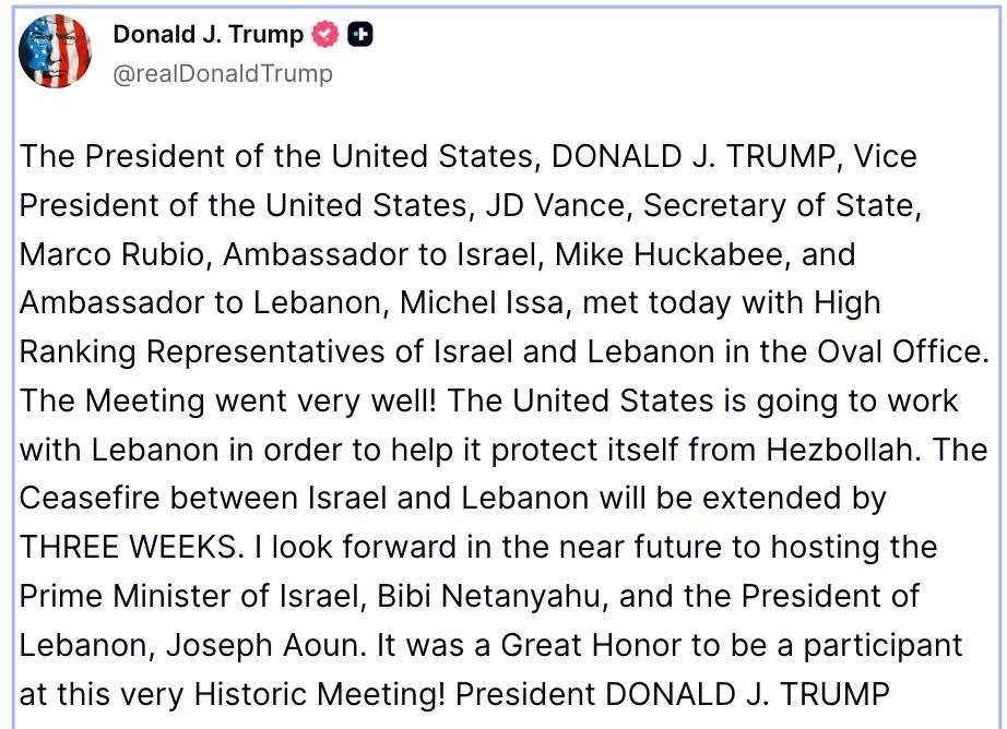 [Photo] 🇺🇸🇮🇷🇮🇱🇱🇧🇱🇧Trump announced the extension of the ceasefire between Israel and Lebanon fo [...]