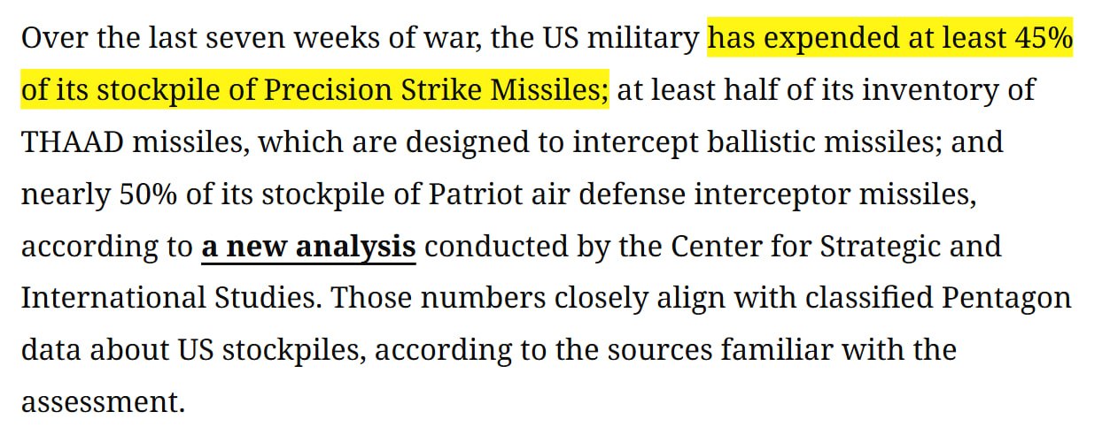 Over the last seven weeks of war, the US military has expended at least 45 of its stockpile of Precision Strike Missiles; at least half of its inventory of THAAD missiles, which are designed to intercept ballistic missiles; and nearly 50 of its stockpile of Patriot air defense interceptor missiles - per CSIS report. @IntelSlava
