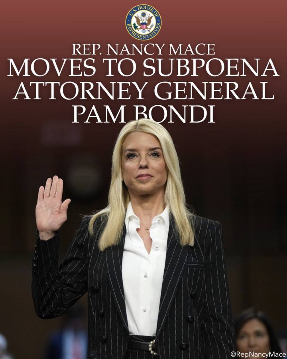 JUST IN - Rep. Nancy Mace announces that congress is moving to subpoena Attorney General Pam Bondi over the DOJ’s release of the Epstein files. Mace: “The Epstein case is one of the greatest cover-ups in American history. His global sex trafficking network is larger than what is being revealed. Three million documents have been released, and we still don't have the full truth.
