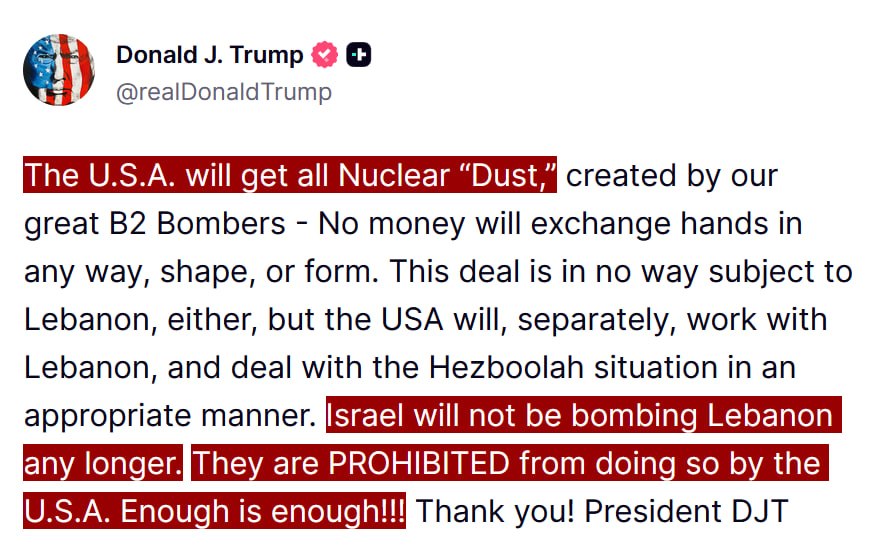 JUST IN - Trump says the U.S. will get all nuclear 'dust' from Iran, and Israel will not be bombing Lebanon any longer. They are PROHIBITED from doing so by the U.S.A. Enough is enough!!!Source: https://truthsocial.com/@realDonaldTrump/posts/116420395293904982@disclosetv
