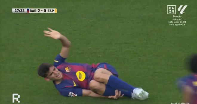Los servicios médicos del club entraron rápidamente para atender al futbolista, que pudo completar los primeros cuarenta y cinco minutos pese a la incomodidad del jugador. El futbolista se tocaba la espinilla y el tobillo cuando era atendido en la banda. Sin embargo, el técnico alemán optó por la prudencia y realizó el cambio táctico antes de iniciar el segundo tiempo, dando entrada a Marc Casadó en su lugar.Eric Garcia pasó a jugar de central con el cambio y Marc Casadó ocupó el lugar de Eric en el centro del campo.