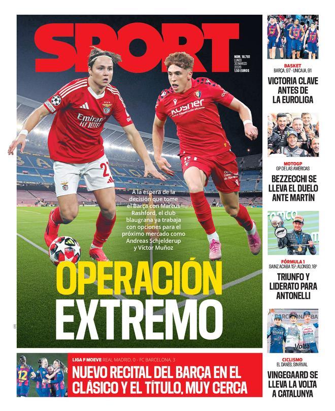 Image ID: 128569685 Esta es la portada de SPORT de hoy lunes, 30 de marzo de 2026 Sport.es /clip/a30b524b-cc95-4881-9960-d89d7621ce22_source-aspect-ratio_default_0_x853y699.jpg 1707 2097En fútbol femenino, el Barça volvió a demostrar su superioridad en el Clásico frente al Real Madrid. Las azulgranas se impusieron con claridad (0-3) y firmaron otra actuación brillante que deja el título de Liga muy cerca. El equipo continúa dominando con autoridad la competición y se encamina hacia un nuevo campeonato.En baloncesto, el Barça logró una victoria importante ante Unicaja (97-91) que refuerza la confianza del equipo antes de afrontar el exigente tramo final de temporada. En el mundo del motor, el Gran Premio de las Américas de MotoGP dejó a Marco Bezzecchi imponiéndose finalmente a Jorge Martín en una carrera muy disputada.Por su parte, en Fórmula 1, el joven piloto Antonelli logró la victoria y se coloca como líder del campeonato. Finalmente, en ciclismo, Jonas Vingegaard confirmó su gran estado de forma y se adjudicó la Volta a Catalunya, dominando la clasificación general.Todo esto y mucho más en sus quioscos de confianza.
