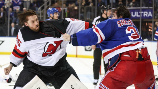 Nacionālās hokeja līgas (NHL) regulārās sezonas spēlē Ņujorkas Rangers savā laukumā ar 4:1 pārspēja Ņūdžersijas Devils. Trešā perioda vidū izkāvās vārtsargi Jākobs Markstrems un Igors Šestjorkins.