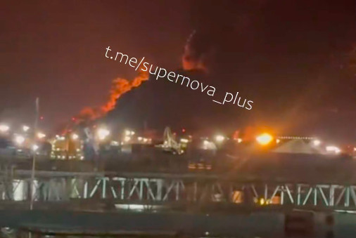 A drone strike triggered a fire at Russia’s Baltic port of Ust-Luga.