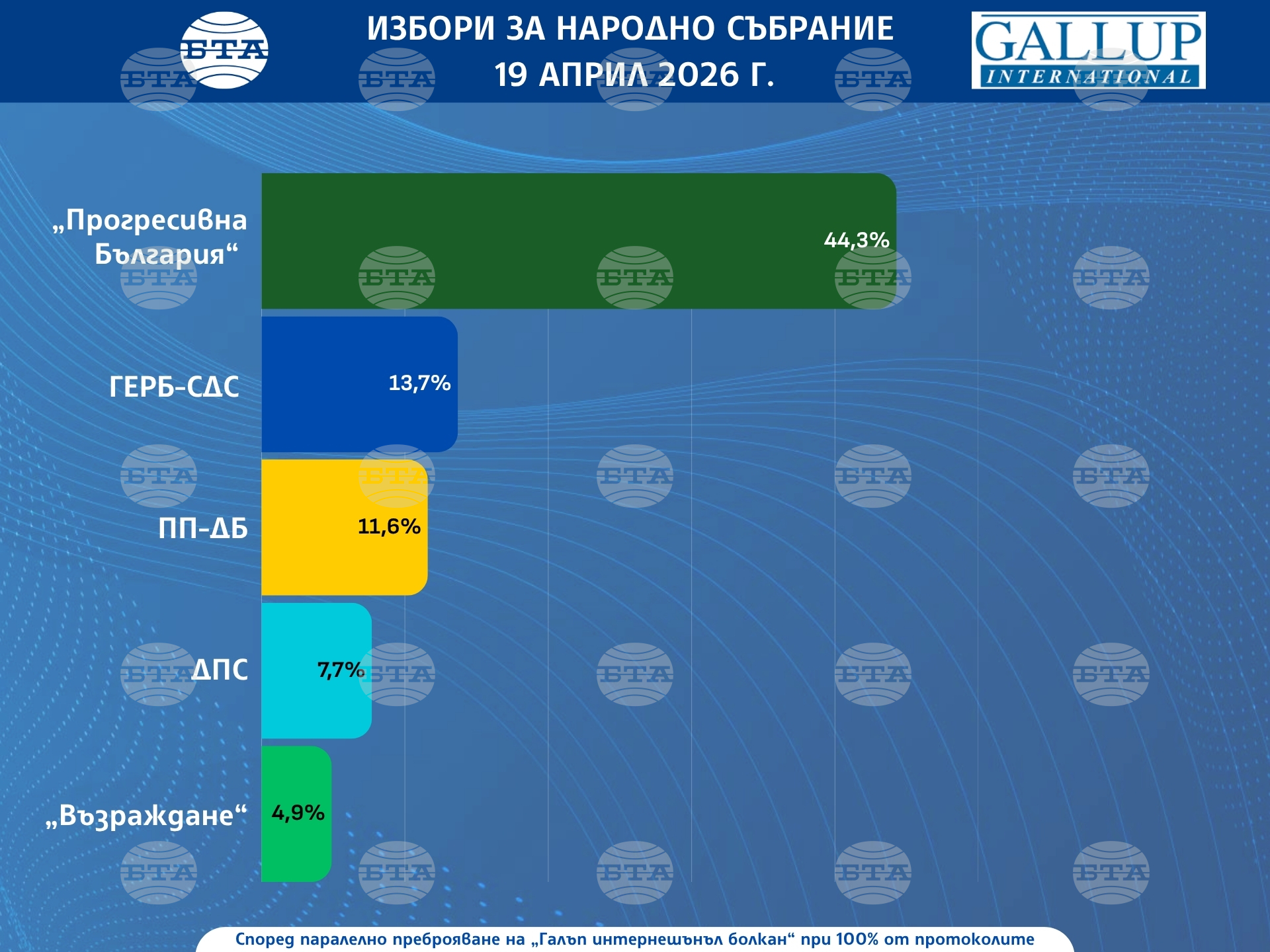 Според 100-процентна извадка от паралелното преброяване на Галъп интернешънъл болкан“ Прогресивна България“ е с 44,3, а ГЕРБ-СДС - с 13,7, съобщиха от агенцията. Продължаваме промяната - Демократична България” е с 11,6 на сто, ДПС – 7,7, и Възраждане” – 4,9 на сто. Под 4-процентната бариера за влизане в парламента остават Сияние“ – 3,3, БСП–Обединена левица” – 3,2, МЕЧ – 2,9, и Величие” – 2,5.