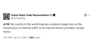 The US government has renewed its criticism of South Korea’s network usage fee policy, underscoring a persistent friction point in bilateral trade relations. The Office of the United States Trade Representative said Monday (local time) in a post on X that “no country in the world imposes network usage fees on the transmission of internet traffic by its internet Service providers.