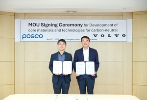 Volvo Construction Equipment and Posco signed a memorandum of understanding Friday at Volvo’s plant in Changwon, South Gyeongsang Province, to work together on developing core materials and technologies for construction machinery in pursuit of carbon neutrality. Kang Ho-jin, vice president of the RD section at Volvo CE, and Lee Kyu-young, head of the steel solution research center were among key executives in attendance.